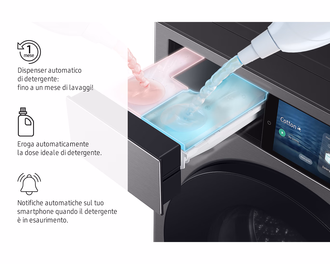 Uno dei punti di forza è il sistema di ecodosatore, che gestisce automaticamente la quantità di detergente e ammorbidente in base al carico.