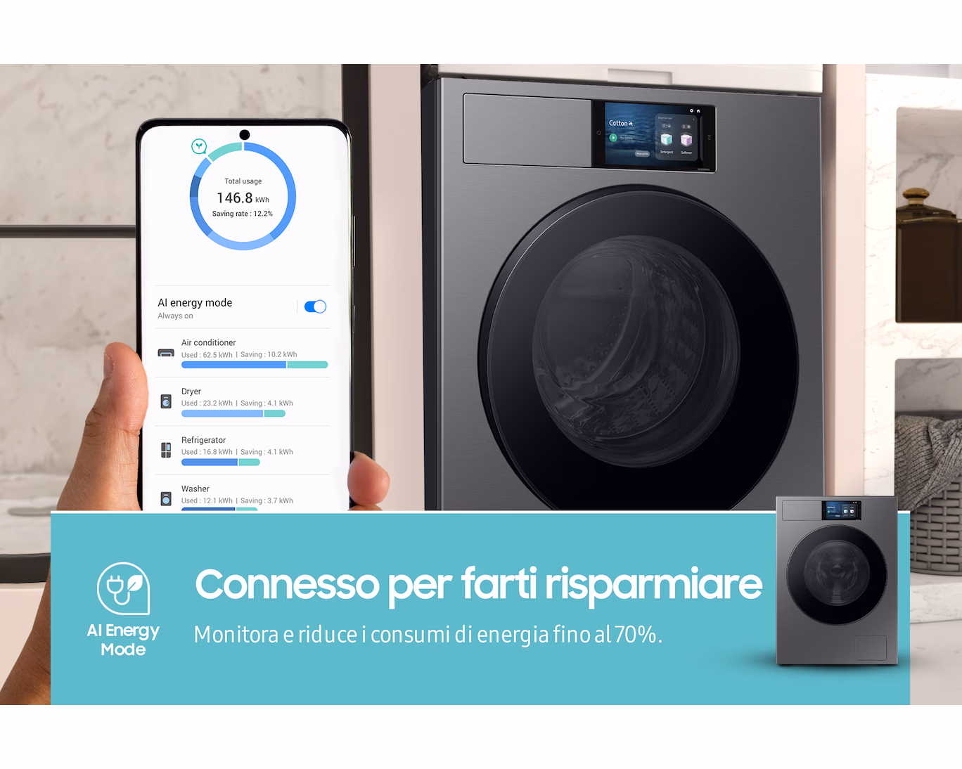 Le lavatrici della gamma Bespoke AI sono progettate per garantire prestazioni elevate nel tempo. Test di resistenza e qualità assicurano affidabilità anche con utilizzi frequenti, mentre la gestione tramite app consente di monitorare lo stato dell’elettrodomestico e programmare la manutenzione in modo semplice e immediato.